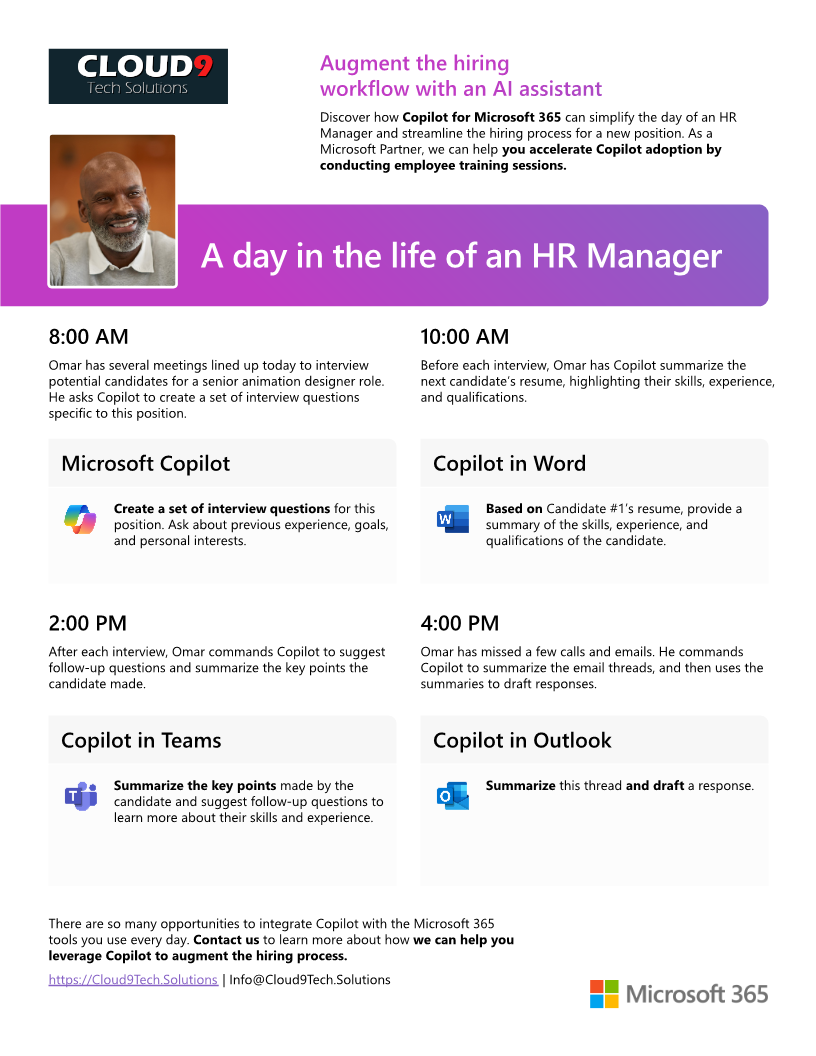 When you bring Copilot for Microsoft 365 into the productivity apps you use every day, you have a virtual teammate who can take on your most time-consuming tasks. As a Microsoft Partner, we can assist your team in optimizing Copilot for a more efficient workday.